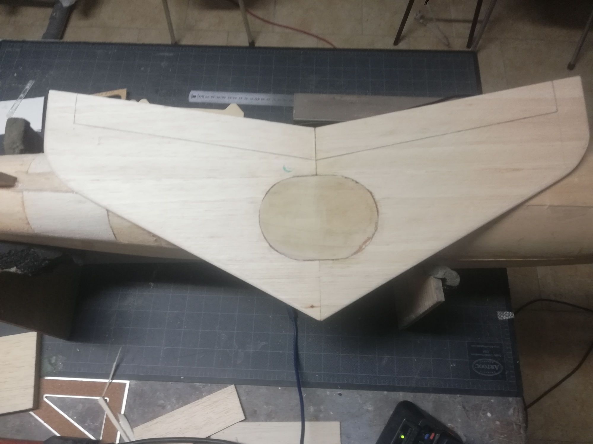 Horizontal stabilizer, made from 6mm balsa plank, solid, and 1mm plywood reinforcement