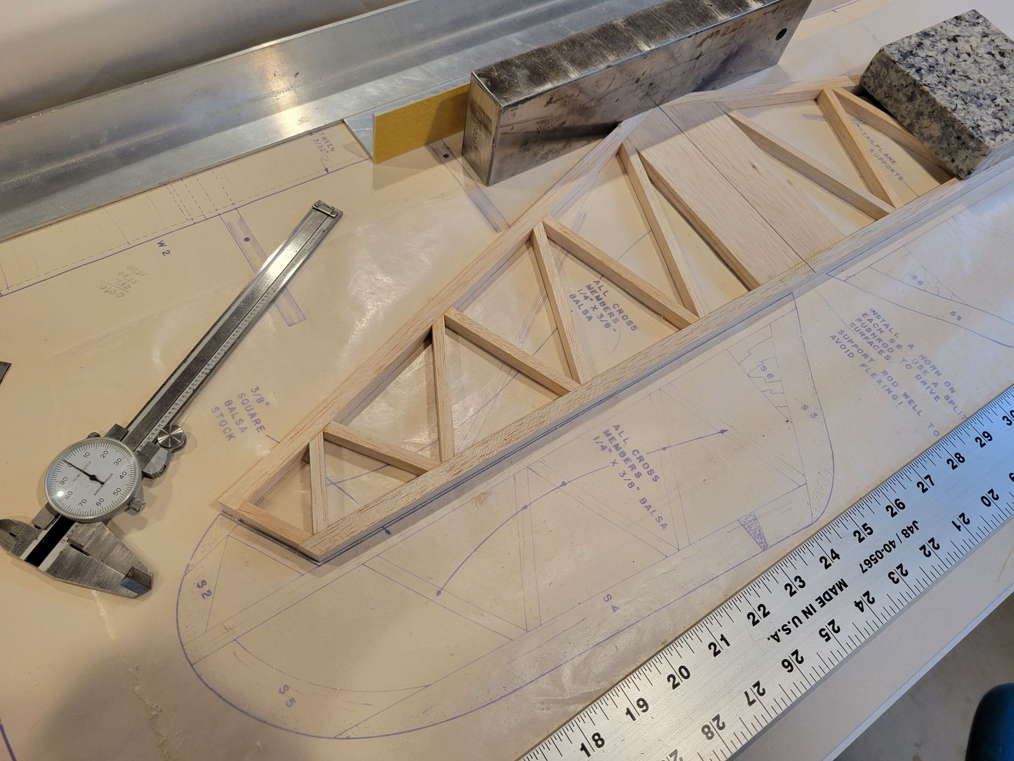 I framed up the horizontal stabilizer. Time to start the elevators. If you notice, the curved pieces S2 and S5 are die cut parts which didn't look very good. So I decided to cut my own and strengthen them at the same time!