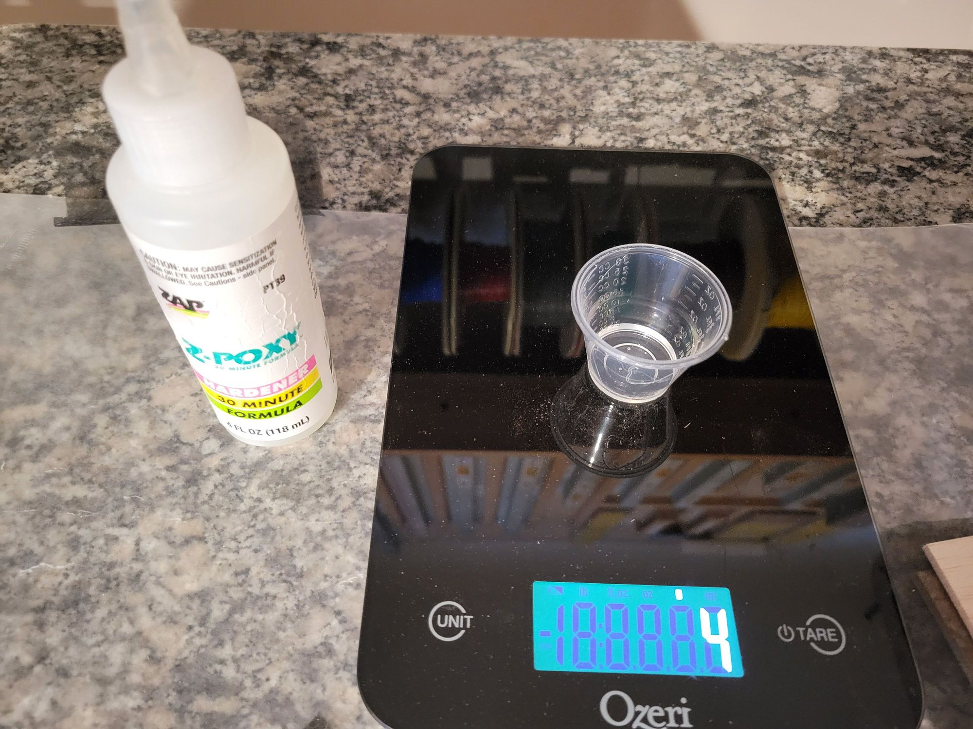 I thought I would take the time to explain how I ensure my ratios between the Resin and Hardener are correct. You certainly can use the markings on the side of mixing cups, but they are cumbersome and hard to read. For better accuracy, I use a scale to measure out the exact amount of each part. Here I've drawn 4 grams of Hardener in the mixing cup.